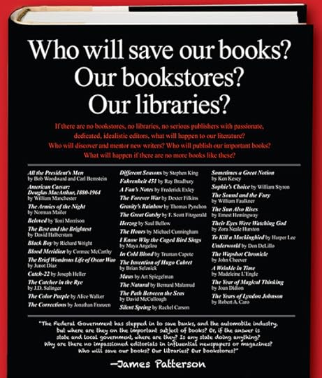 Joe recently blogged about an ad James Patterson posted in the New York Times, decrying the ongoing downfall of book stores et al: