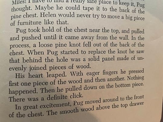 But what that doesn’t say is that Miles is Pug’s great uncle. He died in 1900. When he appears to Pug he is wearing odd clothes that are plainly described and probably made the young me think of Pilgrims! And why in the world did I not remember there was a ghost? Maybe because he was friendly, not at all scary.