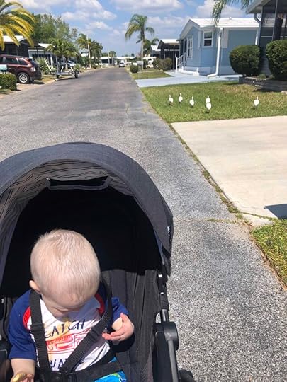 Walking Eleyett in my mil’s neighborhood. He was too busy snacking to notice the birds so I got a shot with them in the background.