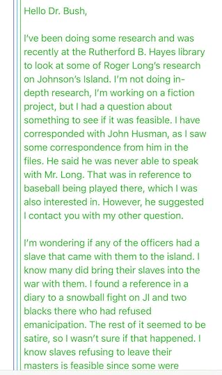 And then something happened, the mysterious germ of a thing that can launch a whole novel! At the library I poured through several diaries and accounts about Johnson’s Island. Then I spotted a mention about two black slaves involved in a snowball fight (which was one of the leisure activities the prisoners engaged in). Why would they have been there? They could not be enslaved in Ohio. So I kept digging through the information and I read that the slaves there had “refused emancipation.” Even the librarians were puzzled by that. So, of course, I researched some more.