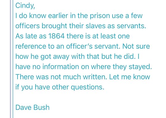 Many slaves joined their masters as they went off to war, charged with keeping their masters safe and looking after them. So many of the men who fought in that war on both sides were very young and their parents probably wanted to safeguard them as best they could. Some of the slaves of course ran off once they were in the north. Many stayed behind enemy lines and did the mundane chores of laundry, cooking, chopping wood, and so forth. Some went into battle with their masters but did not, of course, bear arms. And so, some were captured along with their masters. There was some discussion in the Union army about what to do with them. Most were set free after taking an oath of allegiance to the U.S. government. And then there were the two or three at Johnson’s Island. Why did they stay?