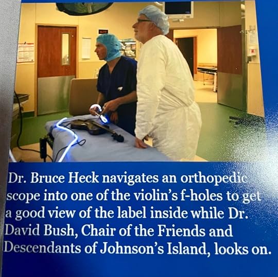 This photo shows Dr. Bush in white helping to investigate a violin that was made in the prison.