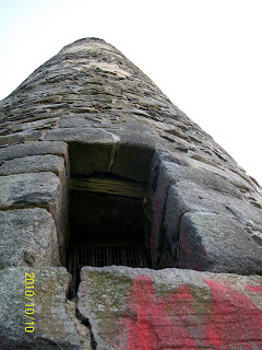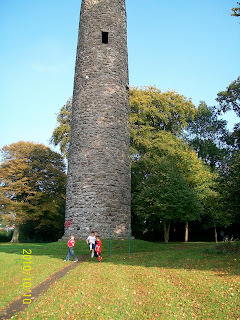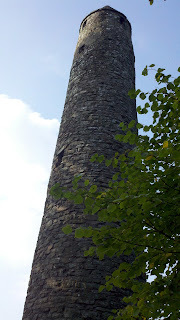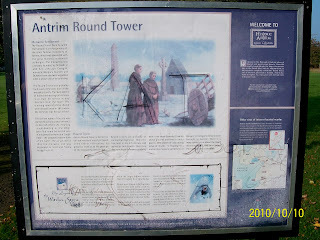 ©CindyThomsonRound Tower in County AntrimWe visited the round tower in Antrim on our first trip to Ireland in 2010. It’s described as one of the best examples of a round tower in Northern Ireland and it was indeed in excellent condition. The tower, 93 feet high, is all that’s left of an early 10th century monastery. The tower is in the middle of a park. Tom snapped a picture of some soccer (football) players in front of it (above). When they knew we were taking pictures, they hurried off. The photo gives a good perspective on how high that door is. On the back side (pictured below) there is a door/window that is not so high.