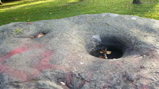 ©CindyThomsonAnother interesting thing about this site is the legend of the Witches Stone. There is a large stone near the tower with two holes or indentations. One thought is that it was used by the monks to prepare their meals and to grind grain. But the Irish, storytellers with great imaginations that they are, couldn’t leave it at that. The legend says that a witch, dismayed at the Christian monks building the tower, climbed up and flung herself off the top. She landed on the stone, leaving an impression of one knee and one elbow. These holes are said to be always filled with water. As you can see, they were when we were there (well, you can see one of them, anyway.) It’s called a bullaun stone. A sign at the site states that the witch must have glided part of the way since the stone is a distance from the tower. Well, those kinds of details never hender a good Irish tale!