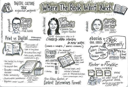 This week I participated in a great panel discussion with Charlotte Harper (published of The N00bz) and book designer Zoe Sadokierski called here the Book Went Next at the National Library of Australia in Canberra. One of the audience members summarised the session in sketch form (this must be a thing) and our talks were recorded. You know, for posterity.