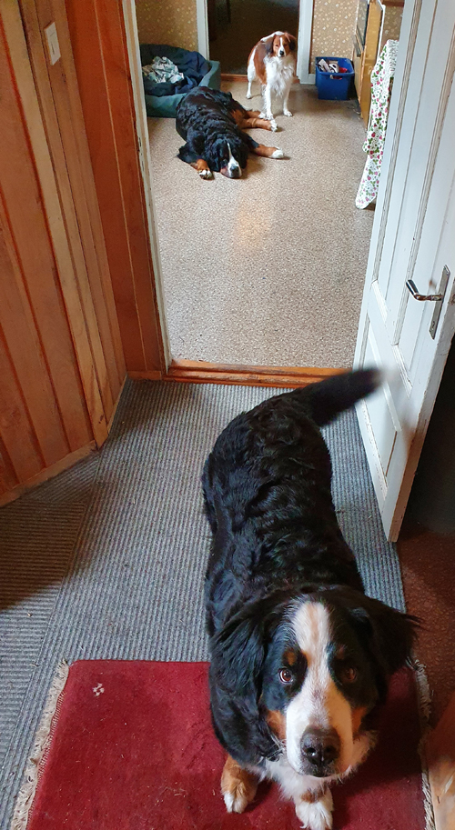 Normalt brukar hundarna få följa med upp till skrivarlyan, men när jag håller föreläsningar får de snällt stanna på bottenvåningen. Så här ser det ut när jag kommer ner efter dagens föreläsningar. Smilla vid trappan, Kiara och Kotten i köket. Det tog inte många sekunder innan det här lugnet byttes ut mot vilda hopp och skall när jag tog sista steget nerför trappan.