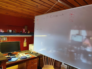 Eftersom jag har många digitala föreläsningar inbokade under våren har jag förberett mig. Tips från författaren Torsten Bengtsson om att ha en whiteboard i bakgrunden nappade jag på. Att köpa en utan ställning kostade 550 kronor. Med ställning kostade den närmare 3.000. Vi löste det genom att hänga whiteboarden från taket.