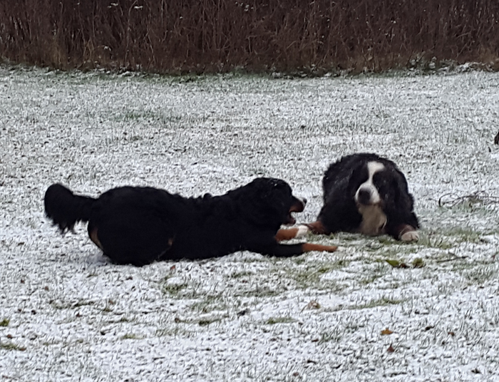 Vi har fått lite nysnö och hundarna blir helt tokiga. Undrar vad Kiara kommer att tycka om när det kommer massor med snö?
