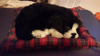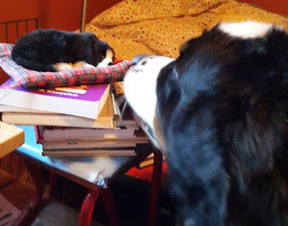 Tudor och Kiara undrade vad det var för något, mycket intresserade. Nu när de väl fått nosa på "valpen" ligger den utom räckhåll för hundarna, för säkerhets skull. Den ligger här vid sidan om datorn när jag sitter och skriver.