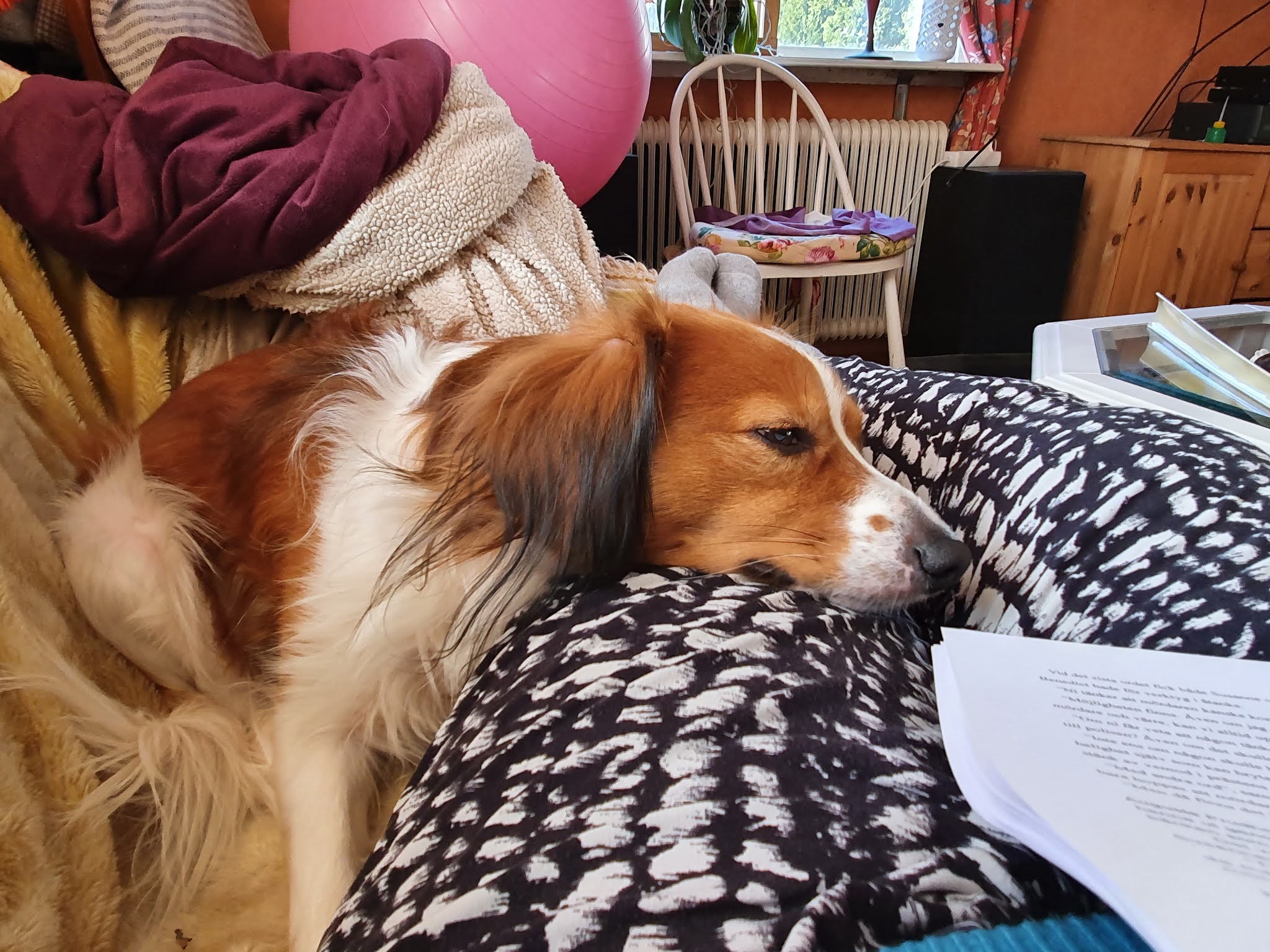 Nu ska jag återgå till korrekturläsning i ryggläge tillsammans med en av mina hundar, här är det kooikern Kotten som håller mig sällskap.