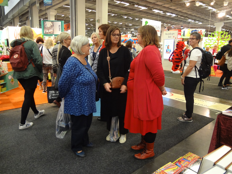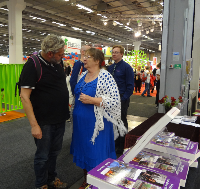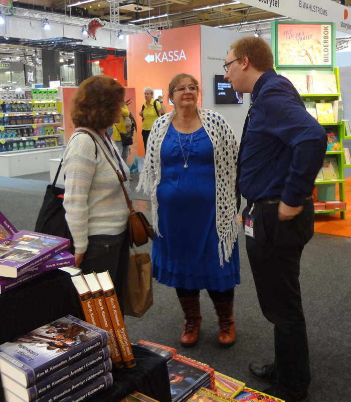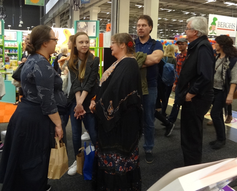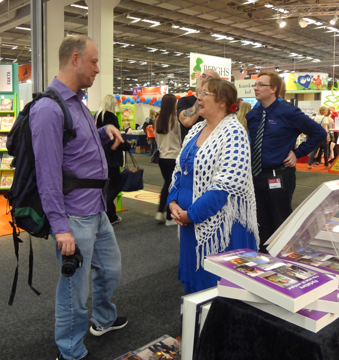 Det blir många trevliga samtal under bokmässan. Den här dagen var det ett minimum av yngre besökare, här är en av de få som kom.