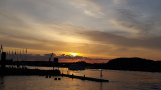 Det var en underbar kväll, helt vindstilla. Medan vi väntade på avgång stod jag på akterdäck och fotograferade solnedgången. Kvällen blev givande, med många intressanta samtal, god mat och härlig musik.