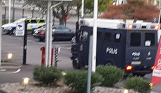 i Falun. "Fem minuter med taxi till Lilla Bommen", sa jag. Det tog närmare 40 minuter. Vi såg poliser, tio i bredd, cirka 100-150 meter långa led, som kom från tre olika gator och strålade samman vid Scandinavium, strax bortanför mässhallarna. Vi hade sett många av poliserna vid frukosten, även om vi inte kände igen dem nu på stan. När vi väl kom fram till båtarna, nervösa för att komma för sent, visade det sig att vi var de första som kom. Alla hade haft lika svårt att ta sig till båtarna, några kom inte ens med, trots att vi väntade 15 minuter extra.