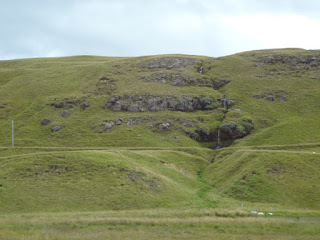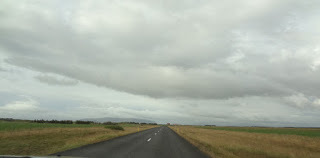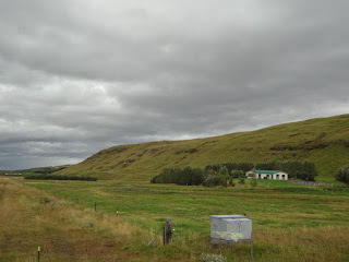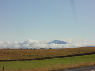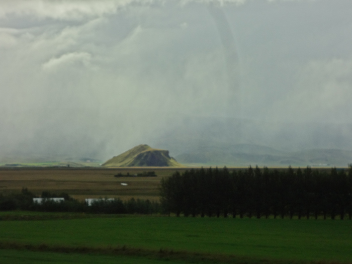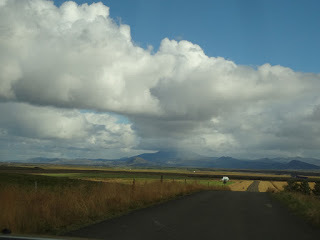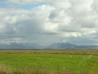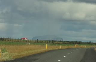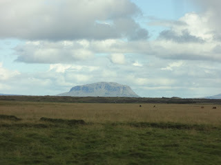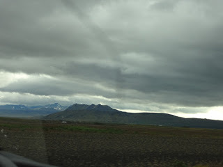 Här har vi stannat för att fotografera Hekla, som ligger rakt framför oss. En vacker syn. Tyvärr hade molnen slingrat sig runt toppen och jag fick inte se Hekla i sin rätta skepnad.