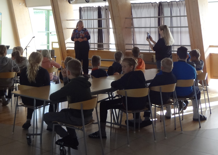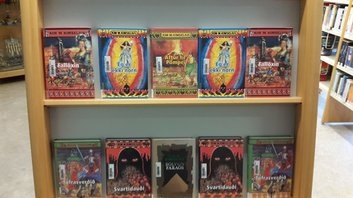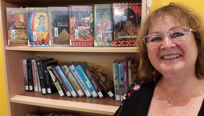 Föreläsning i skolan i Hella. Här står samtliga mina böcker som är översatta till isländska.
