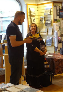 i Uddevalla centrum. Innan dess hade jag föreläst för lärare och bibliotekarier på Biblioteket. De flesta som lyssnat på mig följde med till Hallmans och ställde sig i kö. Klockan tickade sakta framåt. Roger Salmonsson som officiellt skulle inviga boksläppet höll noga reda på tiden, medan jag stampade omkring otåligt bredvid och bara väntade på att få börja signera, men först skulle Roger hålla ett litet tal, sedan var det min tur.