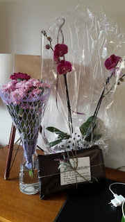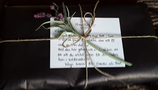 Claudia kom med den fina orkidén till boksläppet, de andra blommorna fick jag från Joakim som äger Hallmans bokhandel. När jag kom hem var det äntligen dags att öppna paketet som låg på rummet och väntade.