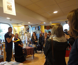 Medan jag väntade på att bli hämtad till föreläsningen, kom ägaren till hotellet, Bart, och lämnade ett paket till mig. Jag ville slita upp papperet och se vad som fanns inuti, men jag sansade mig och lät det vara kvar på hotellet för att i lugn och ro öppna det när jag kom tillbaka från boksläppet. Jag var rörd av Bart och hans fru Claudias omtanke. En lyckönskan inför boksläppet.