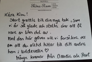 Så här fint hade Claudia och Bart, ägarna till hotell Sköna Rum skrivit på kortet. Och de har rätt. När jag närmade mig Uddevalla kändes det som att komma hem. Jag har tillbringat så mycket tid här, både fysiskt och i fantasin när jag skrev boken, att Sköna Rum och Uddevalla har kommit att bli mitt andra hem.