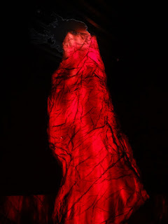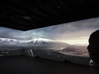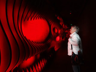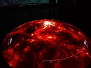Att gå in här var som att gå in i helvetets förgård, allt var blodrött och lite läskigt. Här är det Elín som står och läser på information om någon av alla de vulkanutbrott som varit på Island. Här fanns en informationstavla för varje vulkan, när den haft utbrott, hur mycket aska och lava det hade kommit, samt vilken typ av vulkan det var. Mycket intressant.
