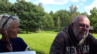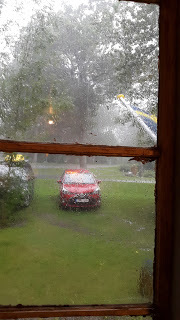 Vid ankomsten på fredagen förbyttes solen i hällregn, åska och hagel. Det var riktigt spännande att sitta inomhus i värmen och titta ut genom fönstret.Det var faktiskt så inspirerande att de som anlänt ville börja skriva direkt. Det fick de gärna göra, jag gav dem ett ämne och de satte igång.