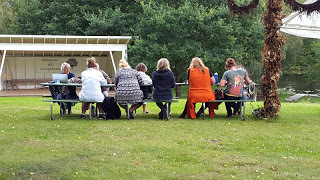 Härlig syn när alla sitter samlade och skriver i sommarvärmen. Ändå var det inte den där riktiga sommarvärmen, många hade koftor på.