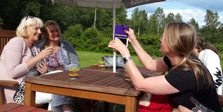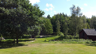 Då har årets skrivarkurser startat. Den första hade jag nu i helgen. Vädret var strålande, ljumma kvällar och morgnar. Dagarna soliga och sköna. Förutom på söndag efter lunch, då regnade det. Bilden är tagen på fredag eftermiddag, när alla samlas och bekantar sig med varandra. Ingen bild av kursdeltagarna, för samtliga satt med sina mobiler och sms:ade att de lyckligt och väl anlänt till Eringsboda.
