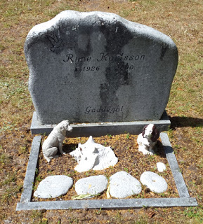 Vi passade på att ta en promenad på lördagens lunchpaus och gick då till kyrkan som hade öppet hus. Jag fick syn på en liten hund vid en grav. Jag såg bara huvudet på avstånd och skyndade fram till graven, där jag möttes av två ljuvliga hundstatyer som vaktade sin husse.