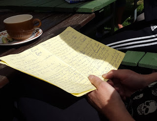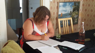 När skrivkursdeltagarna skriver på sina uppgifter passar jag på att läsa de texter de har tagit med sig. Några får panik när jag tar fram rödpennan. Även om det ibland kan bli många röda märken i texten, är det bara små påpekanden. Berättelserna är sagolikt bra!