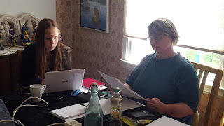 Här sitter Irma Kjellström och Åsa Persson och skriver för fullt. Båda är publicerade författare. Irma har varit med i boken