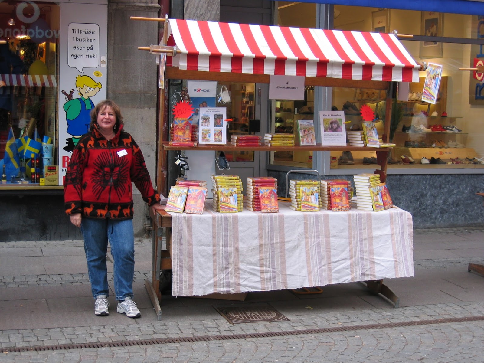 Det här är den äldsta bild jag har hittat. Den är från 2004. Då har jag börjat ge ut böcker på eget förlag sedan två år tillbaka. Här står jag på Lilla Torg i Malmö. Det är massor av bokbord runt mig.
