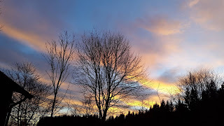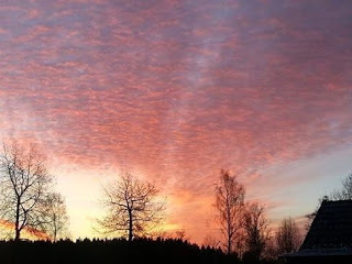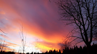 Just inkommen från en härlig morgonpromenad med Tudor. Solen på väg upp och färgar himlen röd. Det var minusgrader och bitande kallt om kinderna. Jag var väl instoppade i en yllekappa, mössa och vantar. Tudor har sin tjocka vinterpäls, vilket gör att han trivs bättre utomhus än inne.