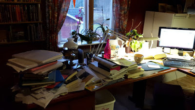 ...är att jag aldrig hinner röja mitt skrivbord. Så här ser det ut just nu på mitt ena skrivbord. Som du ser står datorn i vinkel mellan två skrivbord. Du kan ju bara ana hur det andra skrivbordet ser ut.