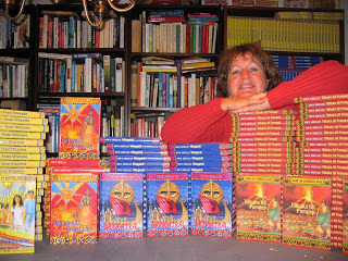 Mitt bibliotek och några av mina böcker: Faraos förbannelse, Den gömda Inkastaden, Vikingaträl och Tillbaka till Pompeji säger mig att det här kortet är taget 2005. Tänk att jag i år, 2016, har kommit ut med 40 böcker. Det hade jag ingen aning om när jag stolt visade upp mina fyra böcker på den här bilden.