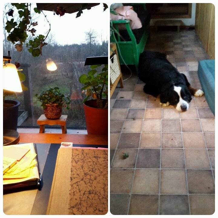 Jag försöker göra något bra av mörkret. Istället för att sitta vid mina vanliga arbetsplatser varierar jag mig. Jag byter arbetsplats och sätter mig i glasgången. Normalt skulle det vara för kallt för att sitta där, eftersom vi bara har 10-11 grader på vintern för blommornas skull. Men jag mår så bra av att sitta där, titta ut i trädgården och ha Tudor vid fötterna, att jag igår tog på mig rejält och satte mig där.