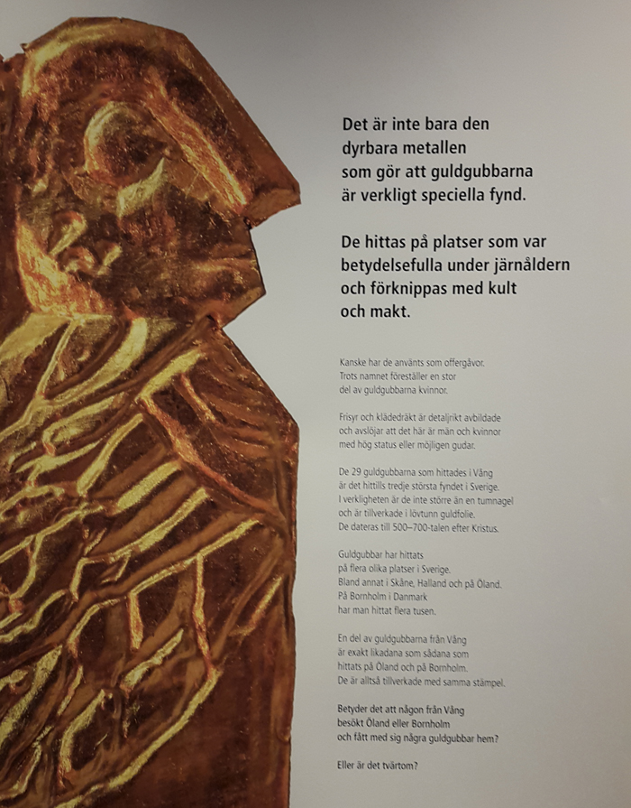 En del av guldgubbarna från Vång är exakt likadana som sådana som hittats på Öland och på Bornholm. De är alltså tillverkade med samma stämpel. Betyder det att någon från Vång besökt Öland eller Bornholm och fått med sig några guldgubbar hem? Eller är det tvärtom? (från Blekinge Museum)