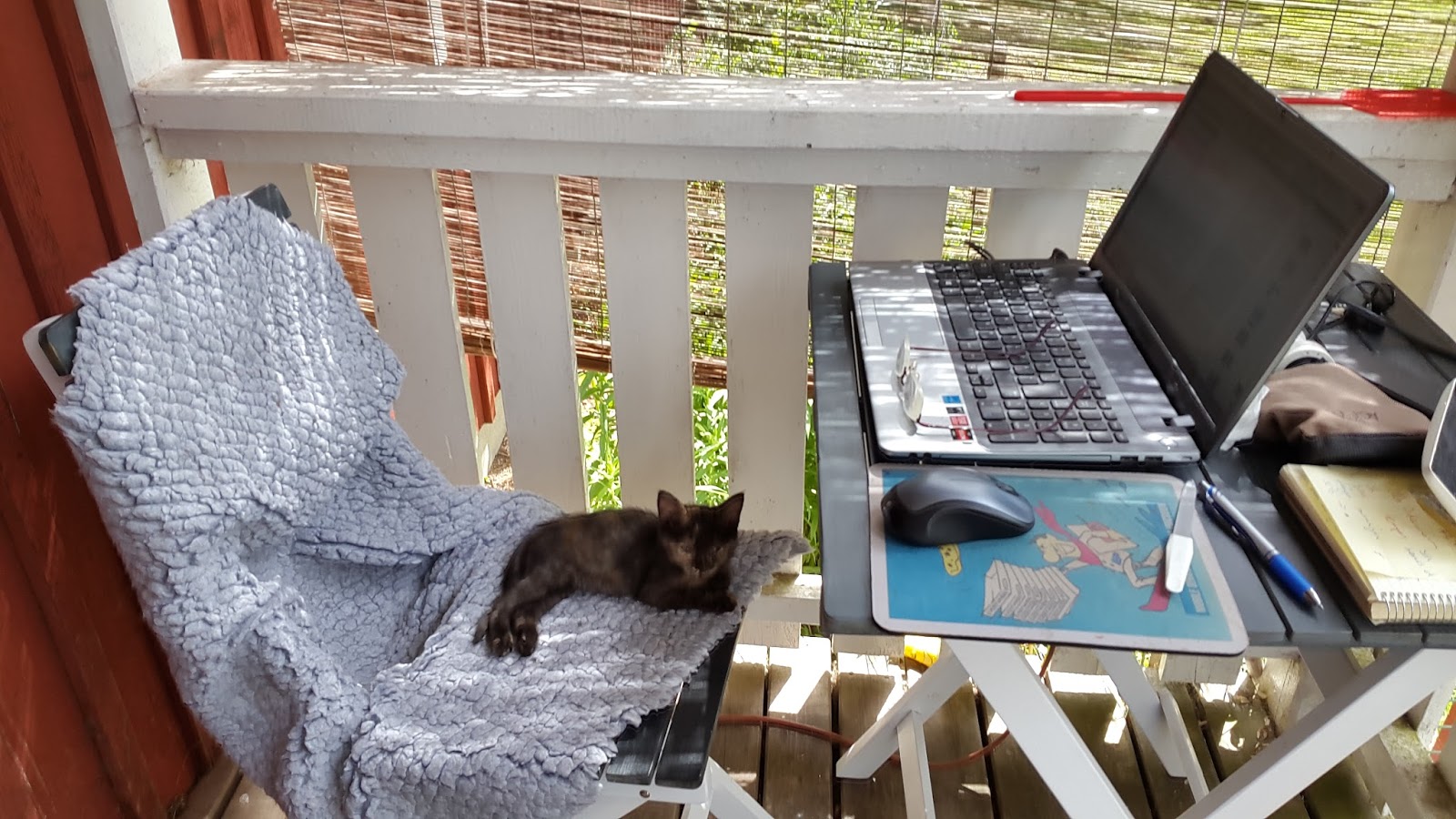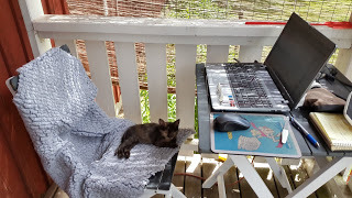 Det är något visst att sitta ute, med ljumma sommarvindar svepande runt mig, med kattungar krälande över mig, undersökande papper och tangentbord.