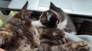 Ibland är det lite svårt att komma till tangenterna när kattungarna pockar på uppmärksamhet, det måste medges. Men det rytmiska kurrandet, de små hjärtslagen mot min kropp, de får själen att må bra och orden att flöda.
