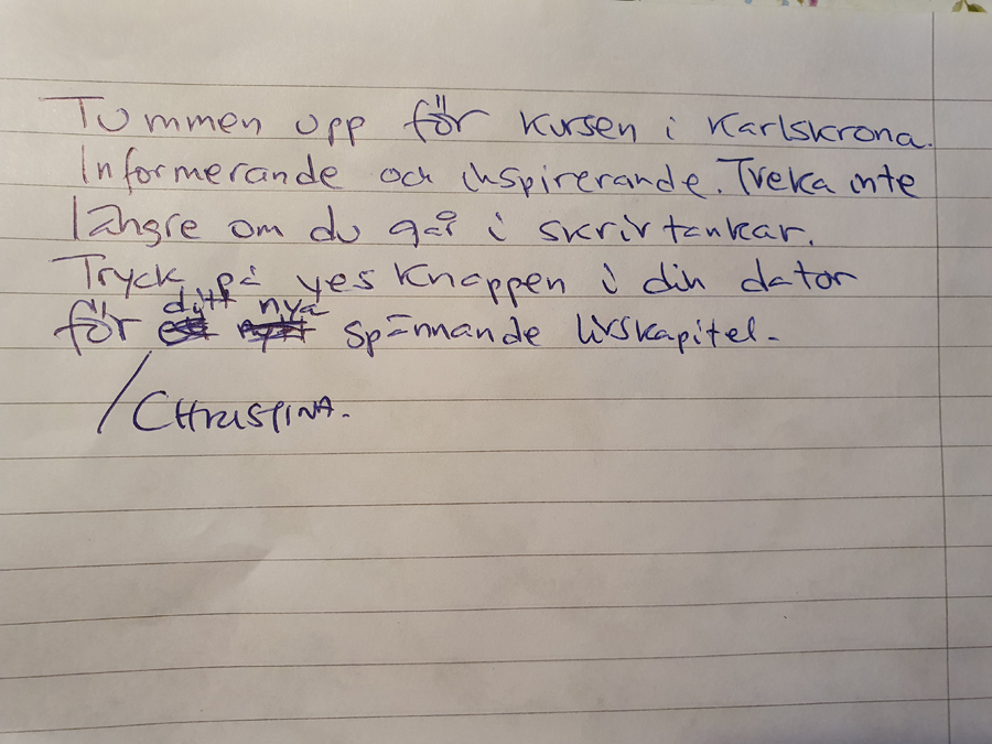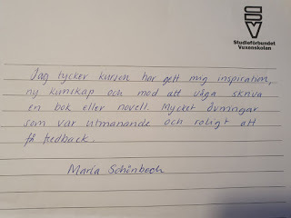 På lördag är det dags att möta några av distanskursdeltagarna, när jag för första gången sedan pandemin ska hålla fysisk skrivarkurs på Studieförbundet Vuxenskolan i Karlskrona. Kursen är mer än fulltecknad så det är väntelista på platserna. Men ingen fara, om två veckor, 17 oktober, håller jag en ny kurs för Studieförbundet Vuxenskolan.