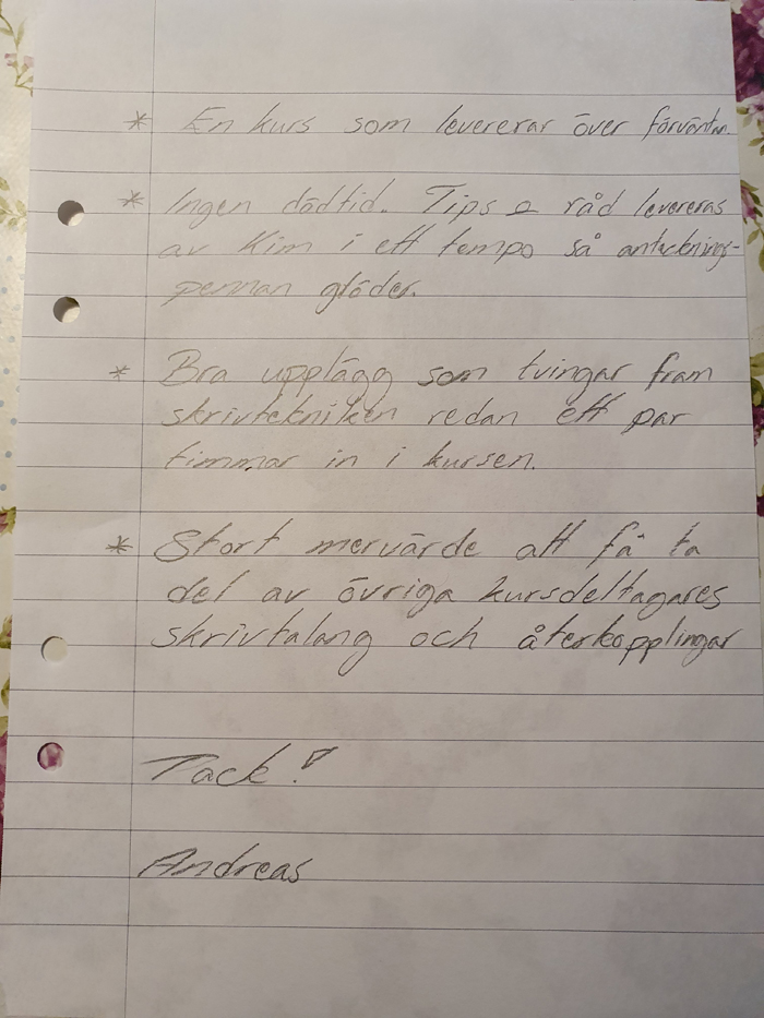 Blev oerhört glad för alla fina omdömen. Hoppas innerligt att jag får se samtliga deltagare igen, då som debuterade författare.