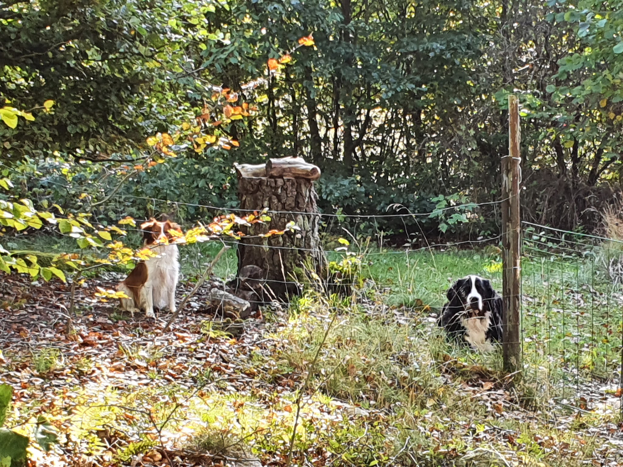 Det var ett år sedan jag var i skrivarstugan. Sedan dess har jag haft hjälp med att ta ner massor av träd, något som gjort att staketet fick försvinna. Därför var jag tvungen att sätta upp nytt staket innan jag kunde släppa hundarna på tomten. Men jag har en liten hundgård och där fick de vara under tiden. Nu när det nya staketet är på plats inser jag att jag behöver åtgärda hundgården också. Provisoriskt uppsatt för många år sedan och så har den förblivit. Men den fungerar, hundarna rymmer inte även om de lätt skulle kunna hoppa över staketet, eller knuffa upp kompostgallret som bara står lutat mot nätet vid utgången.