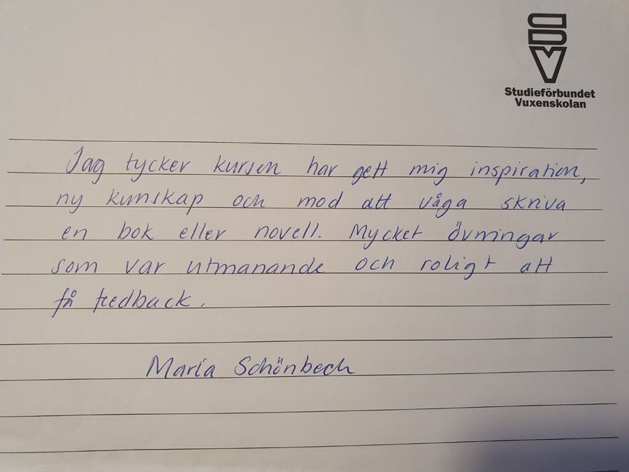 Vill du också gå en skrivarkurs för mig hos Studieförbundet Vuxenskolan i Karlskrona har du chans den 17 oktober. Dessutom kommer det nya kurser till våren. Har du ingen möjlighet att komma nu, finns det distanskurser du kan gå.