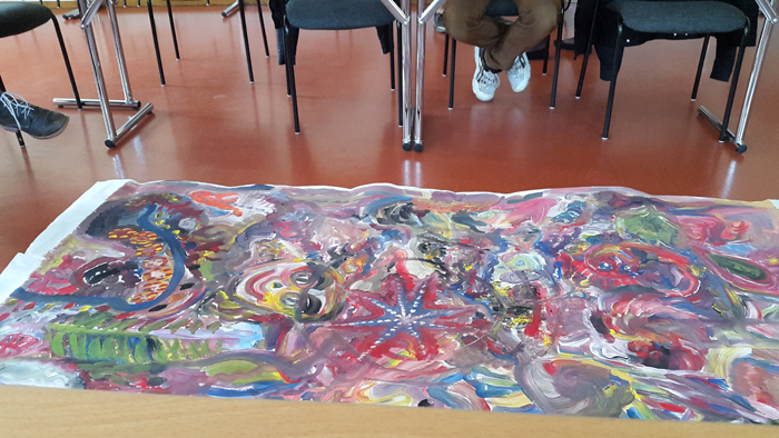Tavlan vi målade första dagen har hängt med alla dagar. Här får den agera matta.