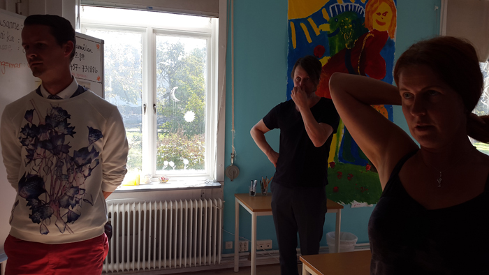 När vi provade på att måla fick vi många roliga uppgifter. En var att två personer skulle måla av den tredje. De skulle hålla i kritan samtidigt och fick inte lyfta den från papperet. Här är det jag som blir avporträtterad av Johan och Camilla.