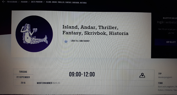 Det här monterprogram såg så lockande ut att jag ville besöka det, tills jag insåg att det faktiskt var mitt program. Kom och hälsa på och hör mig berätta om Island och alla andra spännande saker jag har att dela med mig av. Vi ses på Bokmässan i Göteborg!