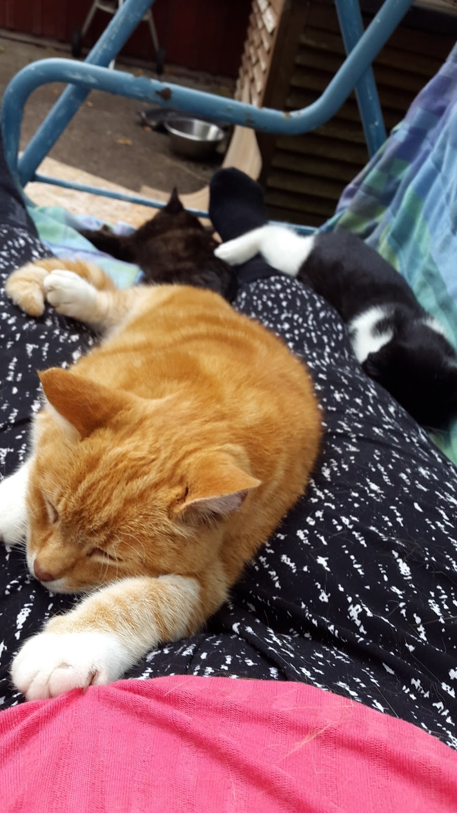 Får jag presentera Grynet, den gula katten som ligger närmast i bild. Troll, den svartvita som ligger till höger om mitt ben och Trulsa, den sköldpaddsfärgade som ligger mellan mina ben. Visst är de ljuvliga?