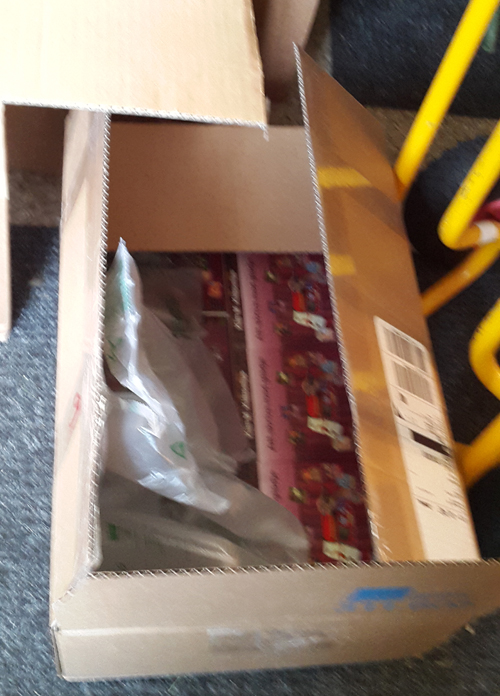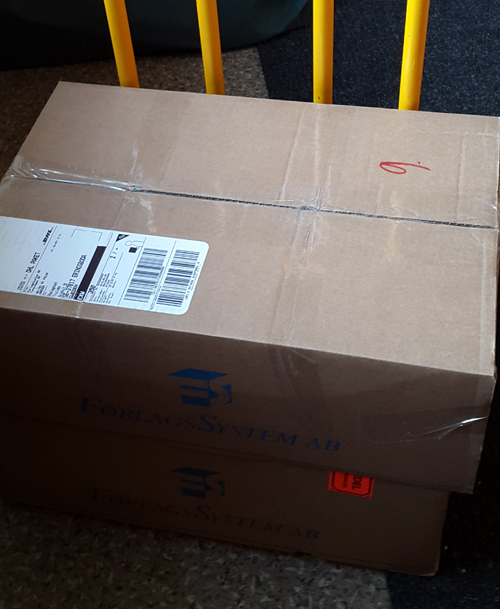 Nuförtiden åker alla böcker direkt till Förlagssystem i Falun, varifrån böckerna skickas ut till bokhandlare och nätbutiker. Men nu är det snart bokmässa, dit fraktar vi böckerna själva och får därför lämning av bokpaket hem till oss. Tre sådana här stora kartonger med