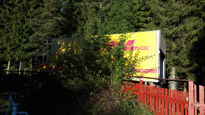 När jag rastade Tudor i trädgården precis innan jag skulle åka iväg till kursen hörde jag ljudet av DHLs lastbil.