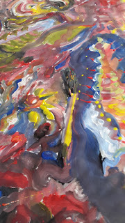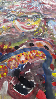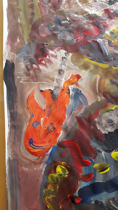 Det här såg jag som djävulens gitarr, medan den som började målningen hade gjort en eldsflamma, som sedan någon annan målat ögon och mun på och strecket ovanpå hade någon annan åstadkommit. Allt skulle gå i ett och våra teckningar knyta an till varandras.