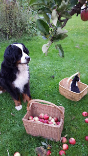 Fick bra hjälp av Tudor och Troll när jag plockade äpplen i korgarna. Även kattungen Trulsa var med, men hon klängde runt i trädet och fick äpplena att falla till marken. Härligt med sällskap.